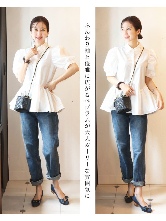ふわりと優雅に広がるペプラムはウエストラインに斜めに入っているので身長を問わずにバランスよく着こなせるデザイン。