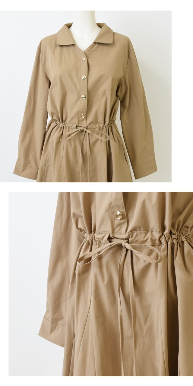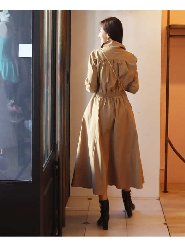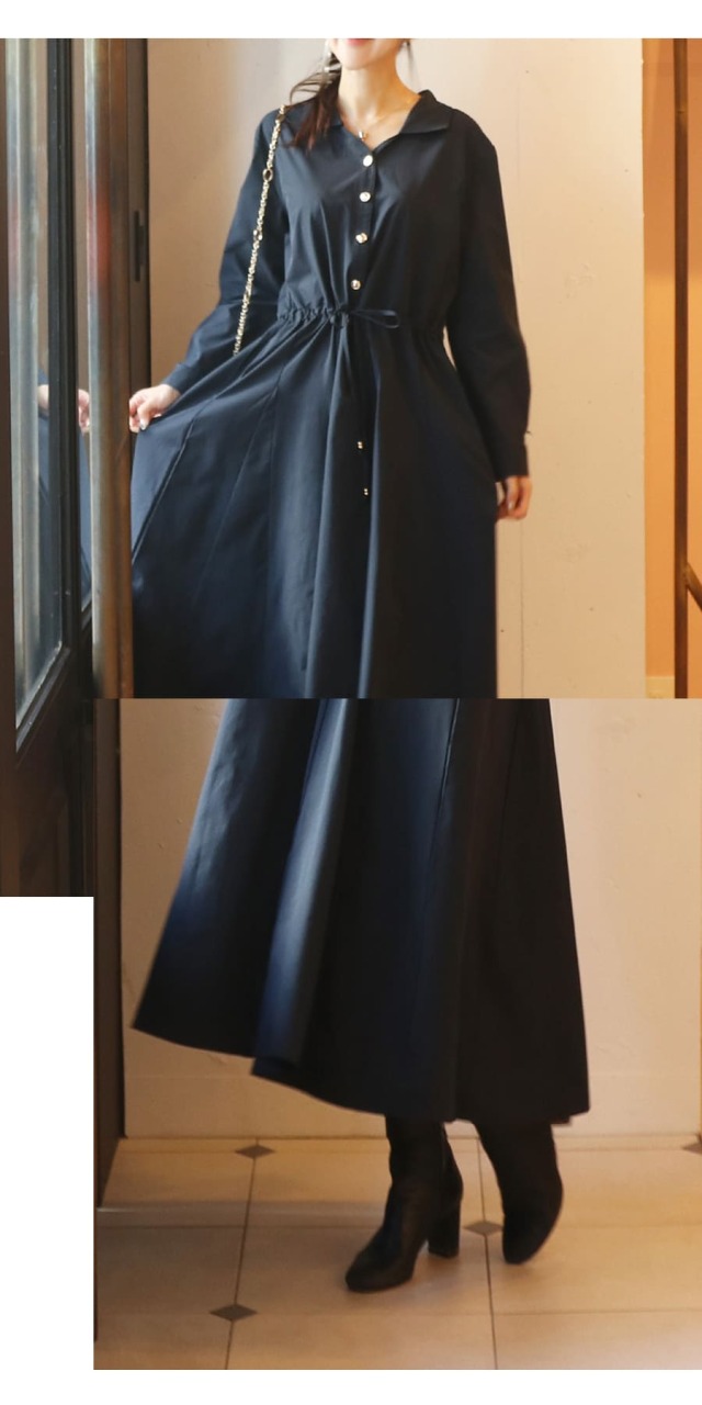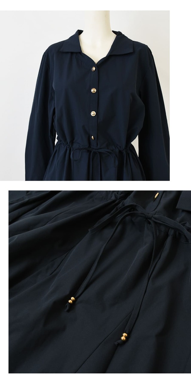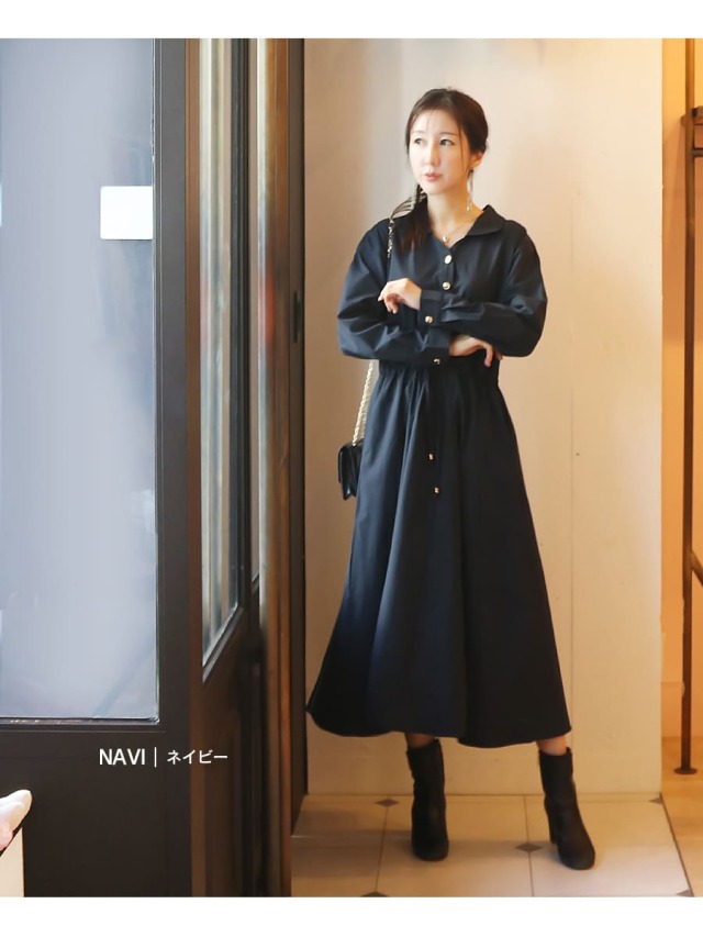 シンプルなデザインのアクセントになっているゴールドボタン&ウエストリボンチャームがリッチな雰囲気をUP!