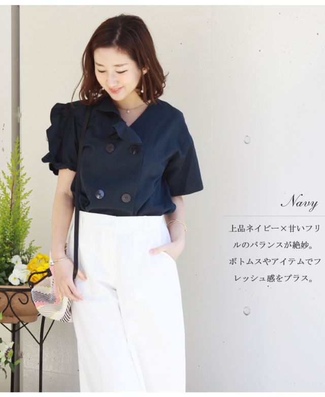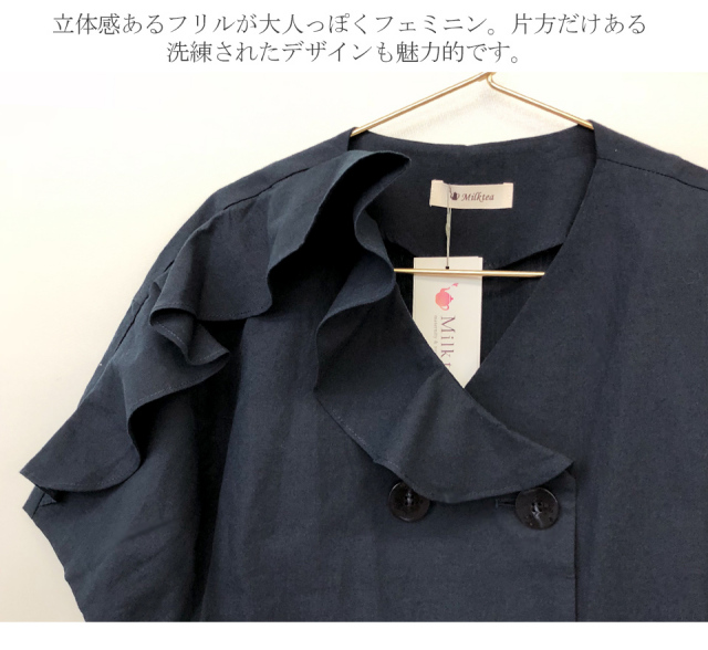 HOMEALL ITEM トップス シャツ・ブラウス 半袖 <ブラウス>リネン&コットン・ビューティフリルブラウス【メール便対応】 当店通常価格: ¥7,790(税込) 価格: ¥7,790 (税込) [ポイント還元 233ポイント~] 販売期間: メーカー: 株式会社ミルクティー 型番: n8225 カラー / サイズ フリー ホワイト 在庫あり サックス × ベージュ 在庫あり ネイビー 在庫あり 数量: 個 カラーサイズ在庫ホワイトフリー在庫ありサックスフリー× ベージュフリー在庫ありネイビーフリー在庫あり 返品交換について ナチュラルな生地とフェミニンなフリルが絶妙な綿麻ブラウス <サイズ> バスト 98cm ウエスト 98cm 着丈 58cm <素材> 麻 55% 綿 45% ※モデル身長は158cm、体重47Kgです。 9,690円 商品説明 ナチュラルな生地とフェミニンなフリルが絶妙な綿麻ブラウス 商品仕様 製品名: <Milk tea next>リネン&コットン・ビューティフリルブラウス(5分袖・綿&麻素材!) 型番: n8225 メーカー: 株式会社ミルクティー 製造年: 2018年